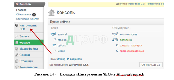 Для того, чтобы перейти к заполнению тегов для главной страницы данного сайта, нужно зайти в админ — панель движка WordPress и найти в верхнем левом углу вкладку «Инструменты SEO» (при условии, что плагин AllinoneSeopack уже установлен на этом сайте.
