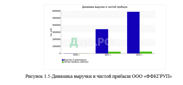 1) Выручка ООО «ФККГруп» значительно увеличилась с 2020 г. по 2022 г. на 3 736 754 тыс.руб., что говорит об эффективной деятельности компании в отношении производственных процессов и на рынке.
