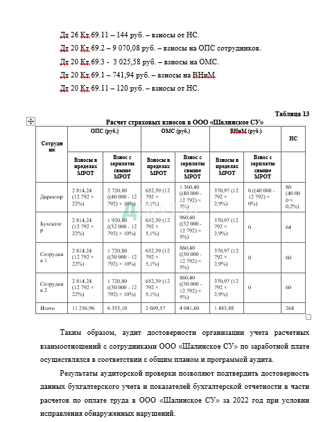 Результаты аудиторской проверки позволяют подтвердить достоверность данных бухгалтерского учета и показателей бухгалтерской отчетности в части расчетов по оплате труда в ООО «Шалинское СУ» за 2022 год при условии исправления обнаруженных нарушений.