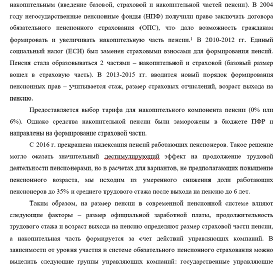 С 2016 г. прекращена индексация пенсий работающих пенсионеров. Такое решение могло оказать значительный дестимулирующий эффект на продолжение трудовой деятельности пенсионерами, но в расчетах для вариантов, не предполагающих повышение пенсионного возраста, мы исходим из умеренного снижения доли работающих пенсионеров до 35% и среднего трудового стажа после выхода на пенсию до 6 лет.