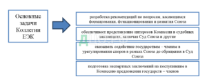 Коллегия Комиссии является исполнительным органом ЕЭК и состоит из членов Коллегии, один из которых является Председателем Коллегии Комиссии. Формируется она из представителей государств. Члены назначаются сроком на 4 года с возможным продлением полномочий. С 2018 года численность коллегии составляет 10 чел. вместо 15 ранее. Основные задачи Коллегии ЕЭК представлены на рисунке 4.