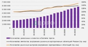 На этом фоне число эмитентов рыночных корпоративных облигаций увеличилось на 40%, количество эмиссий компаний — на 50%, а численность уникальных клиентов в системе торгов Московской биржи выросла более чем в два раза.