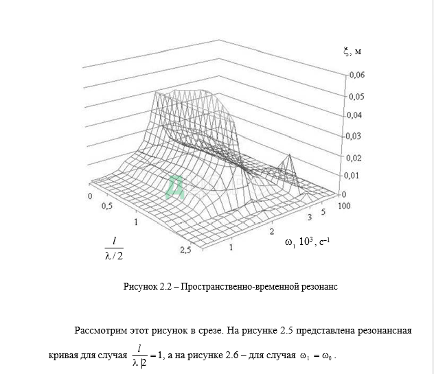 Особый интерес представляет пространственный резонанс. Как видно из рисунка 2.4, максимальное значение отклонения струны превышает значение от- клонения струны при больших длинах волн не более чем на 25%. Но при умень- шении длины волны происходит резкое уменьшение отклонения струны – напри- мер, в случае, когда вдоль струны укладывается 4 полуволны отклонение струны составляет 0,4% от максимального. Также необходимо отметить, что резонансное нарастание амплитуды (рисунок 2.5) не наблюдается в случаях, когда частота вы- нуждающей силы не равна собственной частоте колебаний струны, а также в тех случаях, когда вдоль длины струны укладывается целое число полуволн (в этих точках наблюдаются локальные минимумы – см. рисунок 2.6).