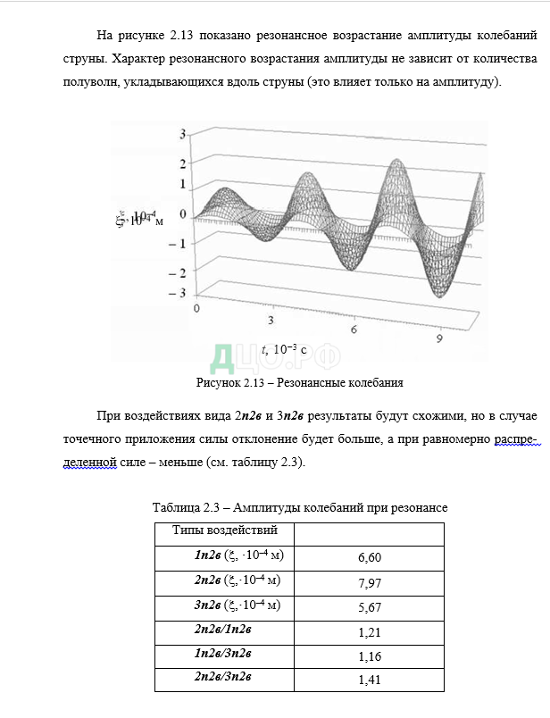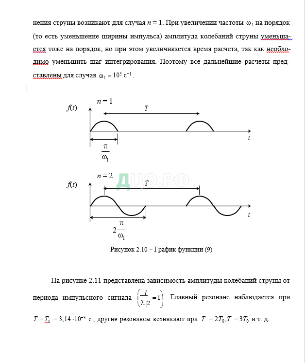 порциями – узкими импульсами, период которых равен периоду собственных ко- лебаний струны (либо кратным периоду, однако в этом случае амплитуда колеба- ний будет меньше). На рисунке 2.26 представлены результаты для случая им-пульсного воздействия с периодом импульса