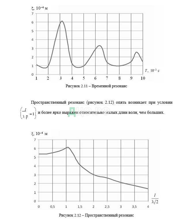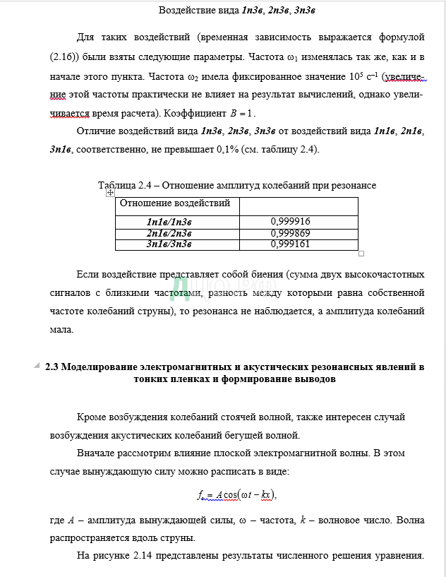 воздействии электромагнитных волн на колебательные системы основное внима- ние должно быть уделено периоду импульсов, который должен быть равен перио- ду собственных акустических колебаний системы, либо других структур, а часто- та и длина волны не так важны, особенно если длина волны больше размеров сис- темы. Также из рисунка 2.18 видно, что минимумы амплитуды наблюдаются, ко- гда вдоль струны укладывается 2,5, 3,5 и т. д. длин волн воздействия, а максиму- мы – 3, 4 и т. д. длин волн.