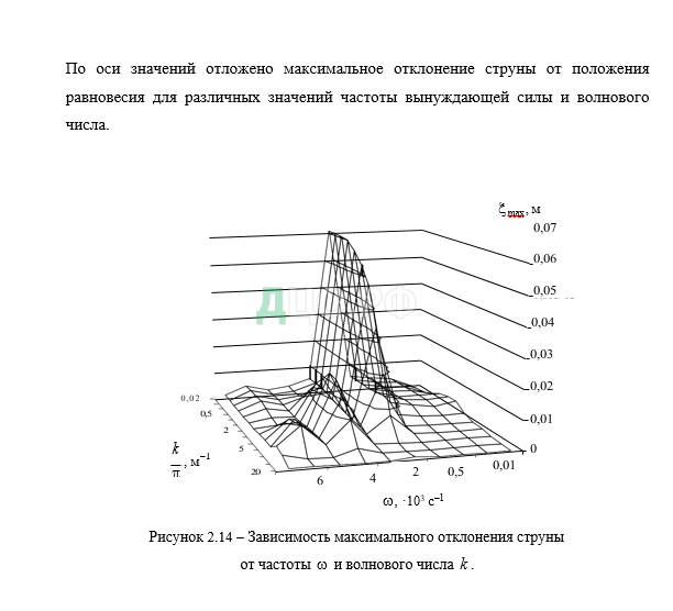 Резонансное увеличение амплитуды наблюдается при частотах, кратных собственной частоте колебаний, максимум смещается в область больших волно- вых чисел k , то есть в область меньших длин волн. Как видно из рисунка 2.15, максимальное значение отклонения колебаний струны достигается, когда частота внешней силы равна частоте собственных колебаний системы, а вдоль струны ук- ладывается больше половины длины волны. Это объясняется тем, что при малых волновых числах слагаемым kx в уравнении можно пренебречь. В этом случае сила практически равномерно распределена вдоль струны и меняется с частотой – классический резонанс. Зависимость максимального отклонения