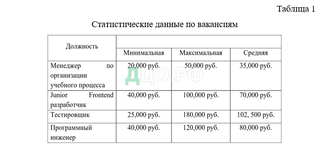 Рассмотрим заработную плату сотрудников вовлеченных в производство программы, для вычисления ее итоговой стоимости и сотрудника отдела расписания для последующего вычисления экономической эффективности разработанной программы. Сведения взяты с сайта распространения вакансий, по указанным, или схожим по обязанностям и требованиям, должностям. Все данные представлены в таблице 1.