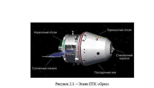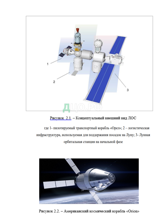 Одним из наиболее перспективных направлений реализации будущих пилотируемых программ можно считать использование лунной орбитальной станции (рис.2.1). ЛОС может использоваться в качестве транспортного узла для различных логистических задач, например, для подготовки ЛВПК к посадке на поверхность Луны или для формирования экспедиционного корабля для исследования дальнего космоса (Марс, астероиды и т.д.). На данный момент разрабатывается КК «Оrion» (рис.2.2) в США и ПТК «Орел» (рис.2.3) в России, для выведения их на ОИСЗ планируется использовать ракету-носитель СТК. Обычно полезная нагрузка РН СТК включает в себя KK и PБ, которые обеспечивают отлетный импульс на Луну и выдают тормозной импульс у Луны при переходе на лунную орбиту. Альтернативным вариантом для этого подхода может быть двухпусковая схема с двумя запусками с отдельными выводами KK и PБ. Тогда для запуска космических объектов потребуется меньшая грузоподъемность, что позволит использовать ракету-носитель тяжелого класса. Конечно, запуск KK и РБ с использованием РН СТК сопряжен с меньшим риском, так как отсутствует необходимость проведения двух близких по времени успешных запусков тяжелого класса для создания на околоземной орбите отлетного лунного комплекса.