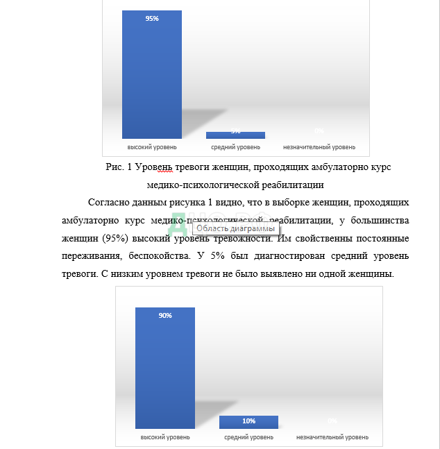 Согласно данным рисунка 2 видно, что в выборке женщин, проходящих стационарно курс медико-психологической реабилитации, выявлен высокий уровень тревожности у большинства женщин (90%). У 10% был диагностирован средний уровень тревоги. С низким уровнем тревоги не было выявлено ни одной женщины.