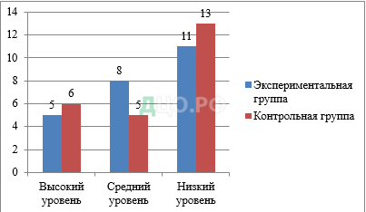 Итоги данных констатирующего и контрольного этапов эксперимента на разных уровнях: недостаточном (низкий уровень) – непосредственно в соотношении с экспериментом констатирующего этапа работы в экспериментальной группе их количество снизилось на 5 чел. (62, 5 %), в контрольной – на 1 чел. (11, 11 %); усредненном – при сравнении непосредственно с проведённым экспериментом констатирующей стадии работы в экспериментальной категории их количество сократилось на 3 чел. (30 %), в контрольной – не претерпело изменений.