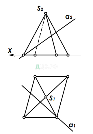 Найти точки встречи прямой а с поверхностью пирамиды.