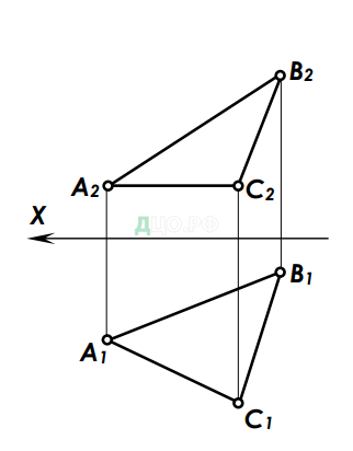 Способом вращения вокруг осей, перпендикулярных плоскостям проекций, определить натуральную величину треугольника АВС.
