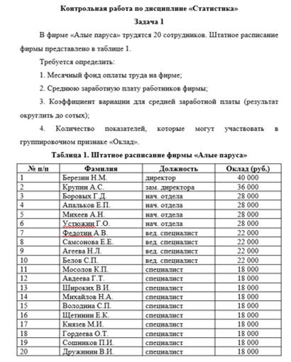 В фирме «Алые паруса» трудятся 20 сотрудников. Штатное расписание фирмы представлено в таблице 1.