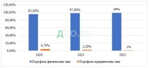 Из рисунка 6 видно, что удельный вес кредитов физическим лицам составляет от 95,3% на 2020 г. в 2021 году этот показатель увеличивается до 97,8% и к концу 2022 г. до 99%. Основной удельный вес составляют кредиты для физических лиц.