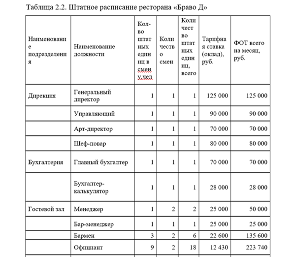 Численность персонала ресторана составит 94 человека, ежемесячные затраты на заработную плату составят 1 999 172 тыс. руб.