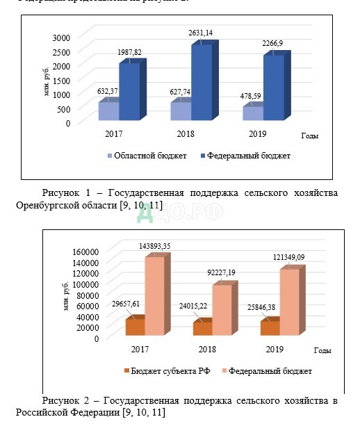 Государственная поддержка за 2017-2019 годы являлась нестабильной и на территории Российской Федерации в целом и в субъекте Федерации – Оренбургской области. Наибольший объем государственной поддержки сельского хозяйства в Оренбургской области пришелся на 2018 год, составив 3258,88 млн. руб., наименьший – 2620,19 млн. руб. За прошедший год государственная поддержка сельского хозяйства составила 2745,49 млн. руб., что на 14% больше 2017 года. Аналогичная ситуация наблюдается и по всей территории Российской Федерации.