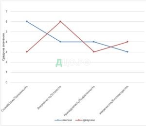 Общими для юношей и девушек являются шкалы: «Приподнятость/Подавленность» и «Уверенность/Беспомощность», что характеризует их как застенчивых, нерешительных, запуганных, стеснительных, подавленных, слабохарактерных.