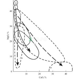 Рис. 2. Соотношение MgO–CaO в мантийных породах. Оконтурены поля составов ксенолитов в кимберлитах (В — вебстеритовых, Г — гарцбургитовых, Д — дунитовых, Л — лерцолитовых, Э — эклогитовых) и поля составов магматических пород (К — кимберлитов, Ка — карбонатитов, Ла — лампроитов). Сплошными стрелками показана эволюция состава кумулатов, пунктирными — остаточных расплавов (Шкодзинский, 2015).