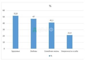 Подтверждает данные выводы и анализ наиболее незначимых терминальных ценностей, среди которых выделены: счастье других (благосостояние, развитие и совершенствование других людей, всего народа, человечества в целом), развлечения (приятное, необременительное времяпровождение, отсутствие обязанностей), красота природы и искусства, творчество (возможность творческой деятельности). Особенно прискорбным является тот факт, что именно альтруистическая ценность «счастье других» получила наибольшее количество выборов как незначимая ценность (46 %). Возможно, данная тенденция является защитной реакцией на жесткость и агрессию современного общества.