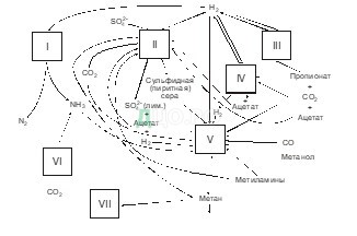 Бактерии, потребляющие: I – нитраты, II – сульфаты; бактерии, образующие: III – пропионат, IV – ацетат, V – метан; бактерии, катаболирующие: VI – аминокислоты, VII – метилированные металлоорганические комплексы.