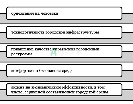 Проект «Умный город» направлен на повышение конкурентоспособности российских городов, формирование эффективной системы управления городским хозяйством, создание безопасных и комфортных условий для жизни горожан. Проект базируется на 5 ключевых принципах (рис. 1):