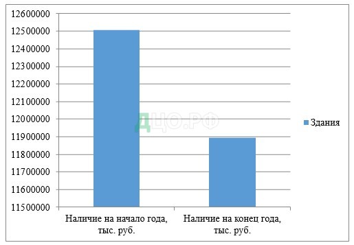 Здания в элементах основных средств на начало периода составило 12506397 тыс. рублей по остаточной стоимости, и на конец периода 11893570 тыс. рублей. Как видно из рисунка 2.1, выбыло около 612826 тыс. рублей за счет амортизации начисленной линейным способом.