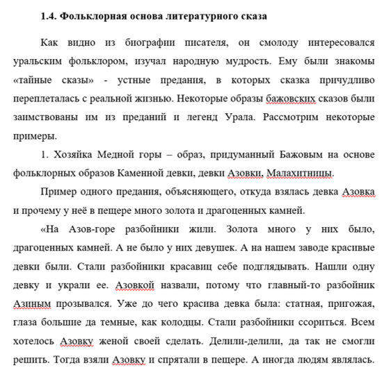 Со сказами Бажова знакомство начинается в самом раннем возрасте. Перед нами возникает волшебный мир героев, подобных сказочным героям русской народной сказки: Хозяйка Медной горы похожа на Василису Прекрасную, Золотой полоз – на Змея Горыныча, Козлик – Серебряное копытце похож на Сивку-Бурку. Но некоторые удивительные образы (Голубая змейка, Огневушка-поскакушка, Синюшка) не встречаются в русских народных сказках. Это герои уральских сказов. Появляется гордость за то, что талантливый уральский писатель П. П. Бажов сумел создать произведения, которые стали достоянием не только уральской, но и русской культуры в целом.