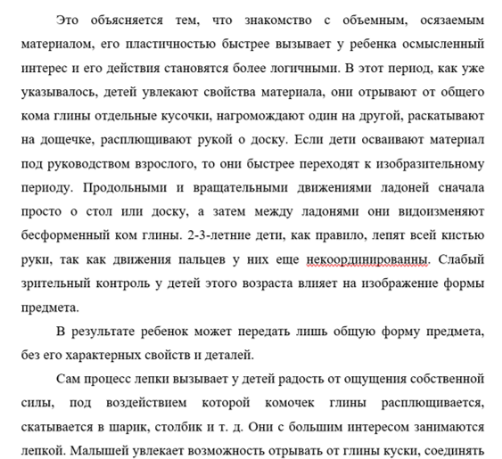 Это объясняется тем, что знакомство с объемным, осязаемым материалом, его пластичностью быстрее вызывает у ребенка осмысленный интерес и его действия становятся более логичными. В этот период, как уже указывалось, детей увлекают свойства материала, они отрывают от общего кома глины отдельные кусочки, нагромождают один на другой, раскатывают на дощечке, расплющивают рукой о доску. Если дети осваивают материал под руководством взрослого, то они быстрее переходят к изобразительному периоду. Продольными и вращательными движениями ладоней сначала просто о стол или доску, а затем между ладонями они видоизменяют бесформенный ком глины. 2-3-летние дети, как правило, лепят всей кистью руки, так как движения пальцев у них еще некоординированны. Слабый зрительный контроль у детей этого возраста влияет на изображение формы предмета.