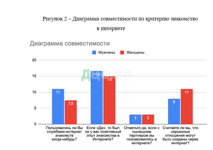 В результате был рассчитан умеренно высокий коэффициент корреляции, что свидетельствуют о том, что те партнеры, которые пользуются службами знакомств, имеют тенденцию к скорому прекращению отношений. И важной задачей в совершенствовании сервисов знакомств является внедрение интегрального подхода к исследованию ценностей партнеров для подбора наиболее совместимого кандидата с внедрением психологической поддержки пары, которая обеспечивает устойчивое развитие семьи и экологичное проживание семейных кризисов.