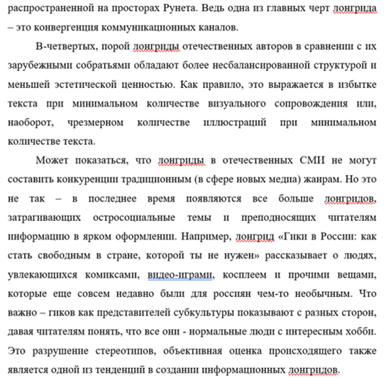[2] Колесниченко А.В. Длинные тексты (лонгриды) в современной российской прессе. Медиаскоп. 2015. № 1. [Электронный ресурс]. URL: http://www.mediascope.ru/node/1691