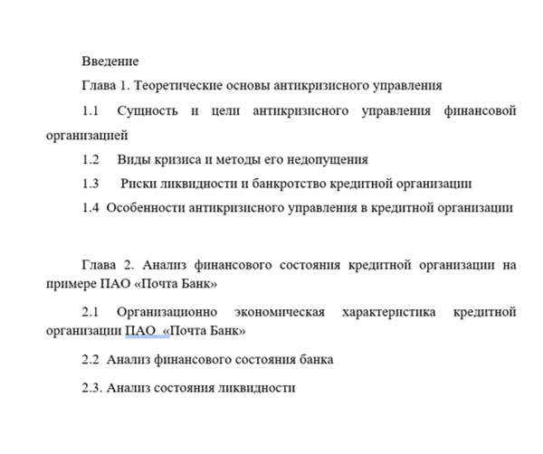 Структура работы представлена введением, тремя главами, заключением и списка использованных источников. Первая глава посвящена теоретическим и методологическим основам антикризисного управления. Вторая глава направлена на анализ финансового состояния кредитной организации на примере ПАО «Почта Банк». В третьей главе разработаны рекомендации по формированию системы антикризисного управления с обоснованием их экономической эффективности.