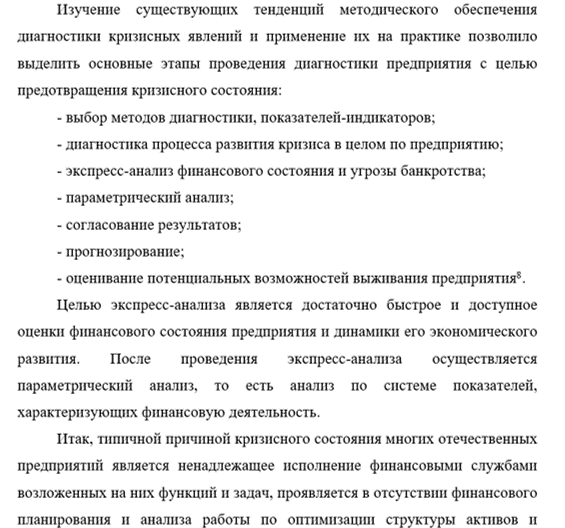 Это актуализирует вопросы ранней диагностики кризисных явлений с целью предварительной профилактики и терапии кризиса. Поскольку любая кризисная ситуация имеет определенные предпосылки возникновения и развития на предприятии.