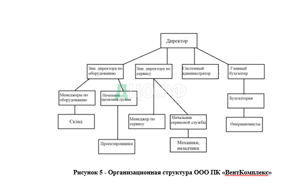 Руководство и контроль за деятельностью ООО ПК «ВентКомплекс» осуществляет директор. В непосредственном подчинении директора находятся заместитель директора по оборудованию, заместитель директора по сервису, главный бухгалтер и системный администратор.