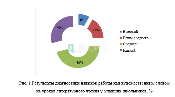 Результаты диагностики навыков работы над художественным словом на уроках литературного чтения у младших школьников показали, что среди детей, принявших участие в диагностике, наибольшая доля представлена группой детей с средним уровнем навыков работы над художественным словом – 11 детей или 46%. Отрицательным результатом является низкое количество детей с высоким уровнем навыков – только 2 человека, а так же достаточно большая доля детей с низким уровнем – 7 человек или 29%.