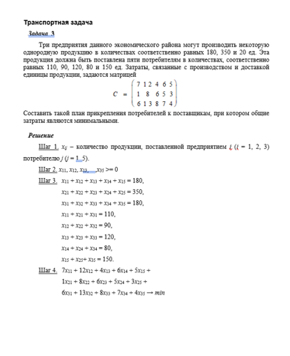 3. Три предприятия данного экономического района могут производить некоторую однородную продукцию в количествах соответственно равных 180, 350 и 20 ед. Эта продукция должна быть поставлена пяти потребителям в количествах, соответственно равных 110, 90, 120, 80 и 150 ед. Затраты, связанные с производством и доставкой единицы продукции, задаются матрицей