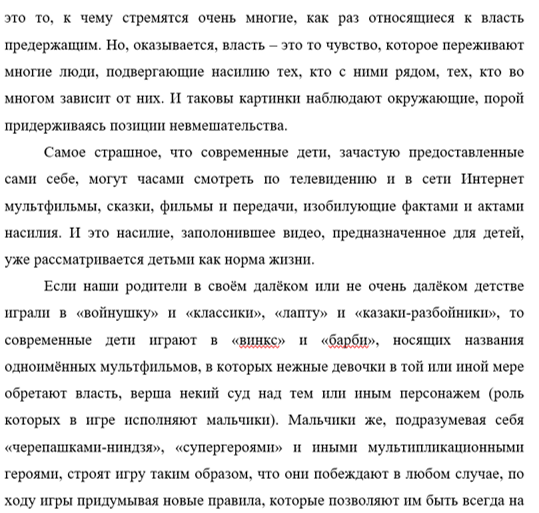 Если наши родители в своём далёком или не очень далёком детстве играли в «войнушку» и «классики», «лапту» и «казаки-разбойники», то современные дети играют в «винкс» и «барби», носящих названия одноимённых мультфильмов, в которых нежные девочки в той или иной мере обретают власть, верша некий суд над тем или иным персонажем (роль которых в игре исполняют мальчики). Мальчики же, подразумевая себя «черепашками-ниндзя», «супергероями» и иными мультипликационными героями, строят игру таким образом, что они побеждают в любом случае, по ходу игры придумывая новые правила, которые позволяют им быть всегда на «высоте». Таким образом, маленькие дети, если, не почерпнув способы насилия в семье и окружающем обществе, приходят к власти над другими детьми, применяя мультяшные правила жизни в обществе, не понимая, правильно это или не приемлемо для детского круга.