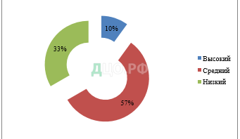 Данные рисунка 1 показывают, что у большинства детей выявлен средний уровень: 57% или 17 детей не всегда проявляют самостоятельность и оригинальность. Так же выявлена достаточно значительная доля школьников с низким уровнем деятельностного компонента: 33% или 10 детей.