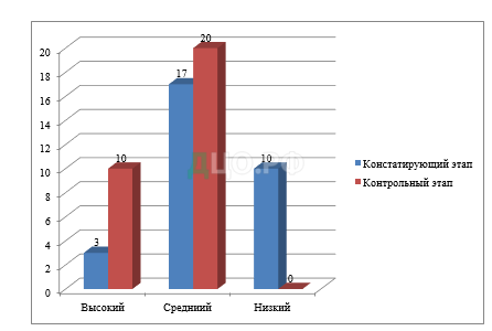Данные рисунка 2 наглядно отражают эффективность опытно-экспериментальной работы. По результатам контрольного обследования, детей с низким уровнем деятельностного компонента выявлено не было. При этом значительно возросло количество детей, которые в ходе выполнения задания открыто проявляли свою фантазию и оригинальность, аи по результатам число детей с высоким уровнем деятельностного компонента составило 10 человек (в сравнении с результатами констатирующего этапа + 8 детей).