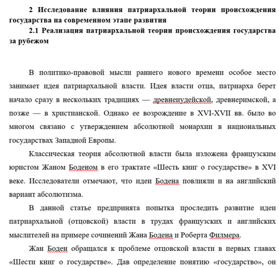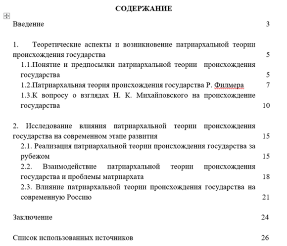 Структура работы представлена введением, двумя главами, заключением и списком литературы. Первая глава посвящена исследованию теоретических аспектов и возникновение патриархальной теории происхождения государства. Вторая глава направлена на исследование влияния патриархальной теории происхождения государства на современном этапе развития.