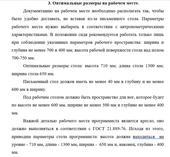 Под рабочим столом должно быть пространство для ног, которое будет по высоте не менее 600 мм, ширине не менее 500 мм и глубине не менее 400 мм.