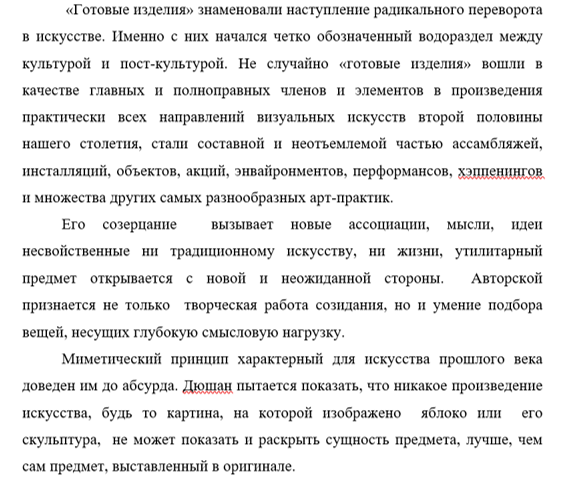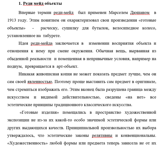 Таким образом, по результатам исследования процесса развития реди мэйд можно сформулировать определение реди – мэйд объекта — объект или текст, созданный не самим автором и (в отличие от плагиата) не с художественными целями в различных видах искусства.