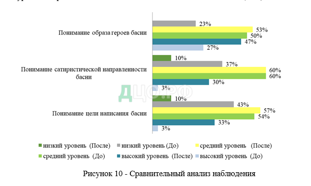 В сравнительно-сопоставительной части исследования мы осуществим сравнительно-сопоставительный анализ нашего исследования полученных первичных результатов. Проанализировав результаты наблюдения можно отметить, что преобладающее большинство учащихся стали хорошо знать басни, ориентироваться в названиях и содержании басен, сформировано умение правильно воспринимать басни, которое предполагает осознание учащимися аллегории и морали басни, понимание школьниками цели написания басни и её сатирической направленности.