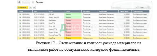Возможность управлять материальными запасами позволит исключить моменты, когда для проведения техобслуживания или ремонта оборудования вдруг не хватает комплектующих или расходных материалов. Функция автоматического контроля неснижаемых остатков обеспечивает своевременный заказ необходимых материалов, деталей, инструментов. Статусы заказа на материалы помогают отслеживать движение материалов на объекты. Также очень полезным является наличие функции учета расхода материалов на выполнение работ (рисунок 17).