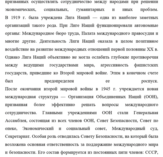 После окончания второй мировой войны в 1945 г. учреждается новая международная структура — Организация Объединенных Наций (ООН), призванная более эффективно решать вопросы международного сотрудничества. Главными учреждениями ООН стали Генеральная Ассамблея, состоящая из всех членов ООН, Совет Безопасности, Совет по опеке, Экономический и социальный совет, Международный суд, Секретариат. Особая роль отводилась Совету Безопасности, на который была возложена основная ответственность за поддержание международного мира и безопасности. Его состав формируется из постоянных пяти членов: СССР, теперь России, США, Великобритании, Китая, Франции и десяти членов, избираемых Генеральной Ассамблеей на срок. Решения по всем вопросам, кроме процедурных, считаются принятыми, если их одобрили все постоянные члены.