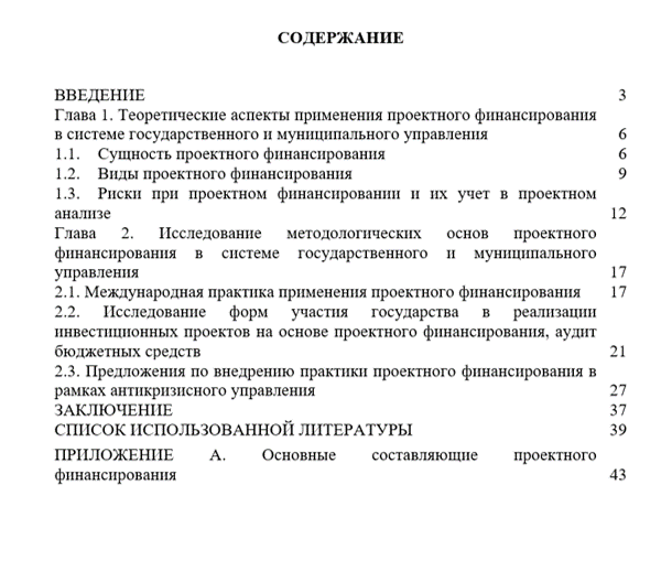 Данная работа состоит из введения, двух глав, заключения, списка использованной литературы и приложения. Первая глава посвящена теоретическому изучению основ применения проектного финансирования в системе государственного и муниципального управления, рассмотрены виды проектного финансирования. Вторая глава содержит исследование форм участия государства в реализации инвестиционных проектов на основе проектного финансирования, аудит бюджетных средств, направлена на выявление проблем внедрения практики проектного финансирования в рамках антикризисного управления.