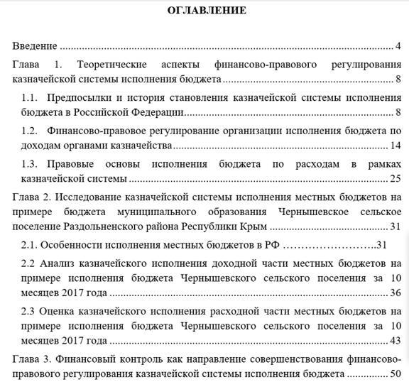 Структура работы. Диссертационная работа состоит из введения, трех глав, заключения, библиографического списка и приложений. Первая глава направлена на изучение теоретических аспектов финансово-правового регулирования казначейской системы исполнения бюджета. Вторая глава содержит анализ аналитического материала по исполнению бюджета муниципального образования Чернышевское сельское поселение Раздольненского района Республики Крым по доходам и расходам. Третья глава диссертационной работы направлена на исследование финансового контроля как направления совершенствования финансово-правового регулирования казначейской системы исполнения бюджета. Работа написана на 80 страницах, включая 11 таблиц, 12 рисунков, 42 источников используемой литературы.