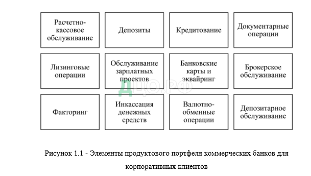 Коммерческие банки формируют свой продуктовый портфель для корпоративных клиентов, включая в него большое количество банковских продуктов и услуг (рисунок 1.1).