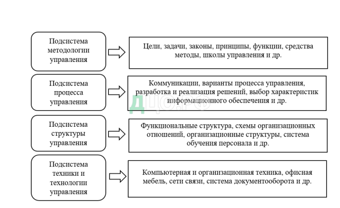 Подсистема процесса управления подразумевает организацию и координацию деятельности субъектов управления путём применения и использования методов управления.