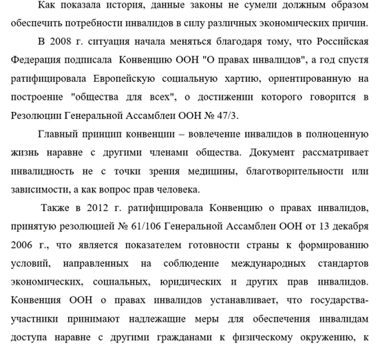 Российскую Федерацию часто называют страной, не приспособленной для комфортной жизни инвалидов. Действительно, получение инвалидности в нашей стране часто сопряжено с огромным числом дополнительных проблем, которые могут решить лишь родственники. Разумеется, в последнее десятилетие предпринимаются шаги к тому, чтобы склонить ситуацию в лучшую сторону: госучреждения обязали иметь специальные пандусы и поручни, частично приспособлен для перевозки инвалидов транспорт в крупных городах и т. д[9]. Однако данная категория граждан по-прежнему остается маломобильной. А ведь многие инвалиды работают или учатся, занимаются общественной, научной, политической деятельностью. Исходя из этого может возникнуть и потребность в перелетах инвалидов в другие города и страны, реализация которой в реальных условиях представляет трудности. Просматривая материалы периодической печати, телевизионные новости, мы видим случаи, когда инвалидам отказывают в посадке на самолет или в продаже билетов, тем самым усугубляя проблемы этой категории граждан. Например, 18 февраля 2009 г. в аэропорту «Домодедово» незрячего пассажира Павла Обиуха не пропустили на борт самолета авиакомпании «Сибирь». В 2015 г. известного экономиста и инвалида-колясочницу Ирину Ясину отказались пускать на борт самолета Пермь – Москва без осмотра медиков. Не все случаи предаются огласке, но очевидно, что проблема есть. В любом случае жизнь инвалидов – это решение множества проблем адаптации, в том числе адаптации к своей низкой мобильности, физическим ограничениям, отношению окружающих.