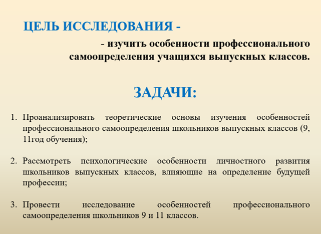 - Проанализировать теоретические основы изучения особенностей профессионального самоопределения школьников выпускных классов (9, 11год обучения);